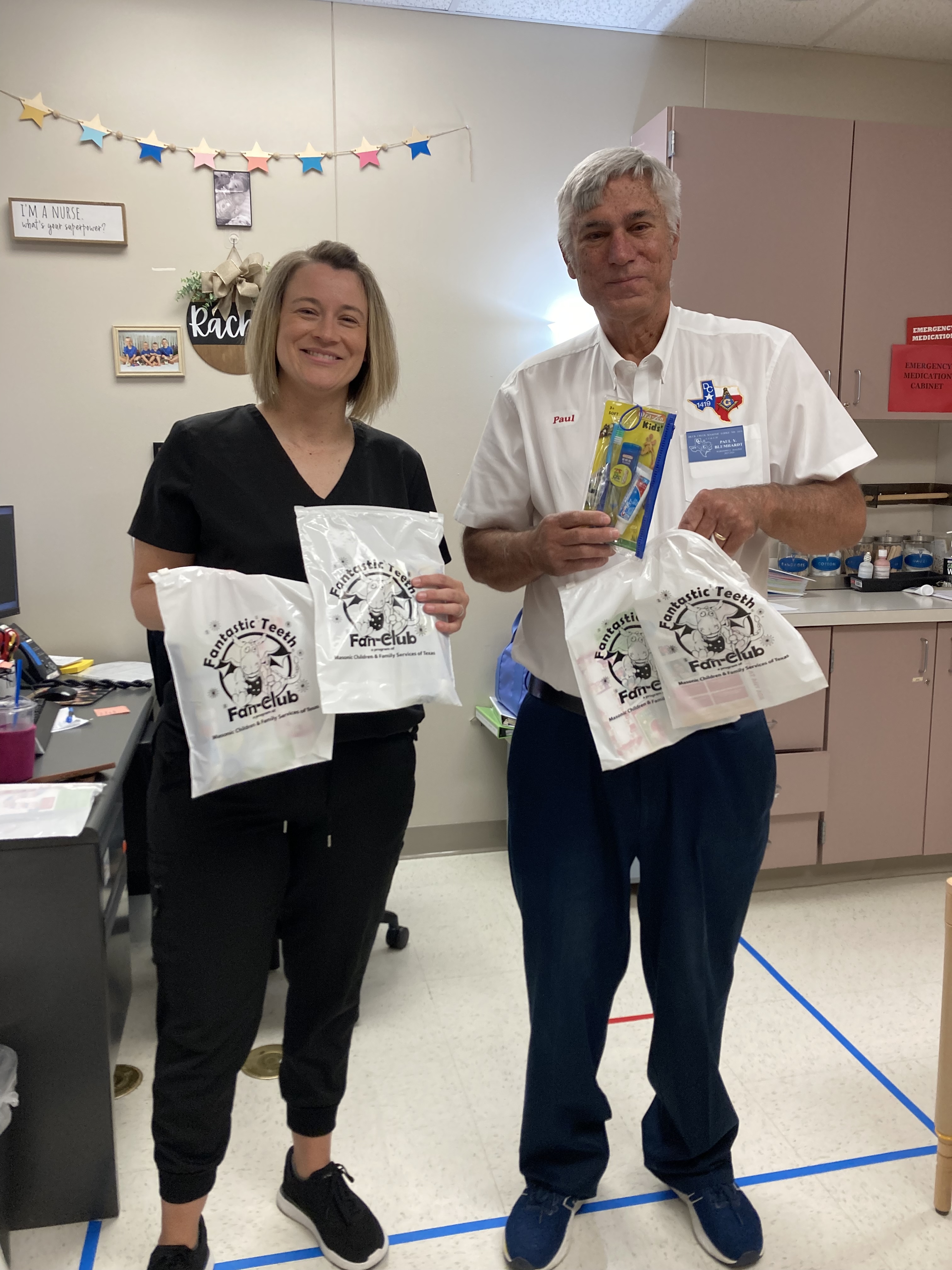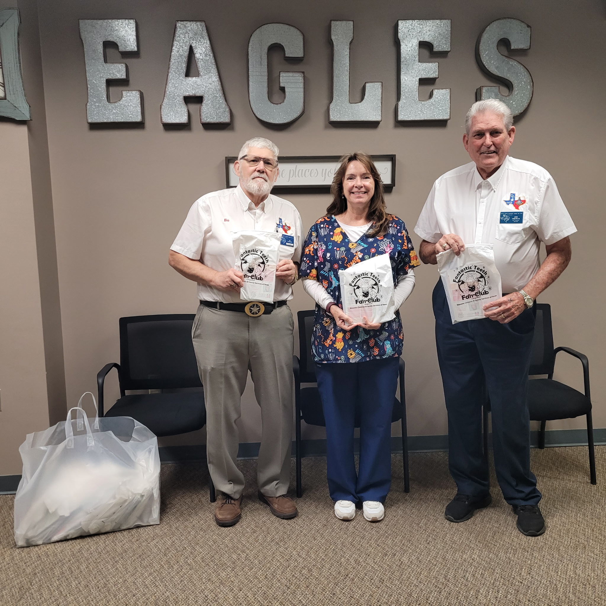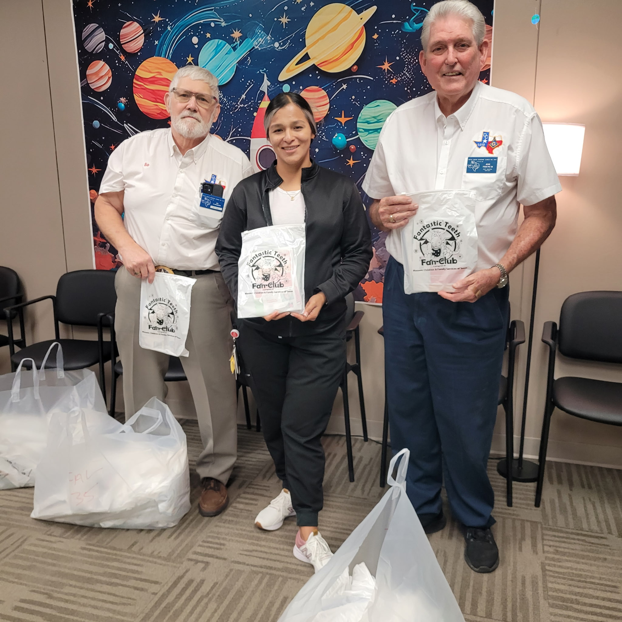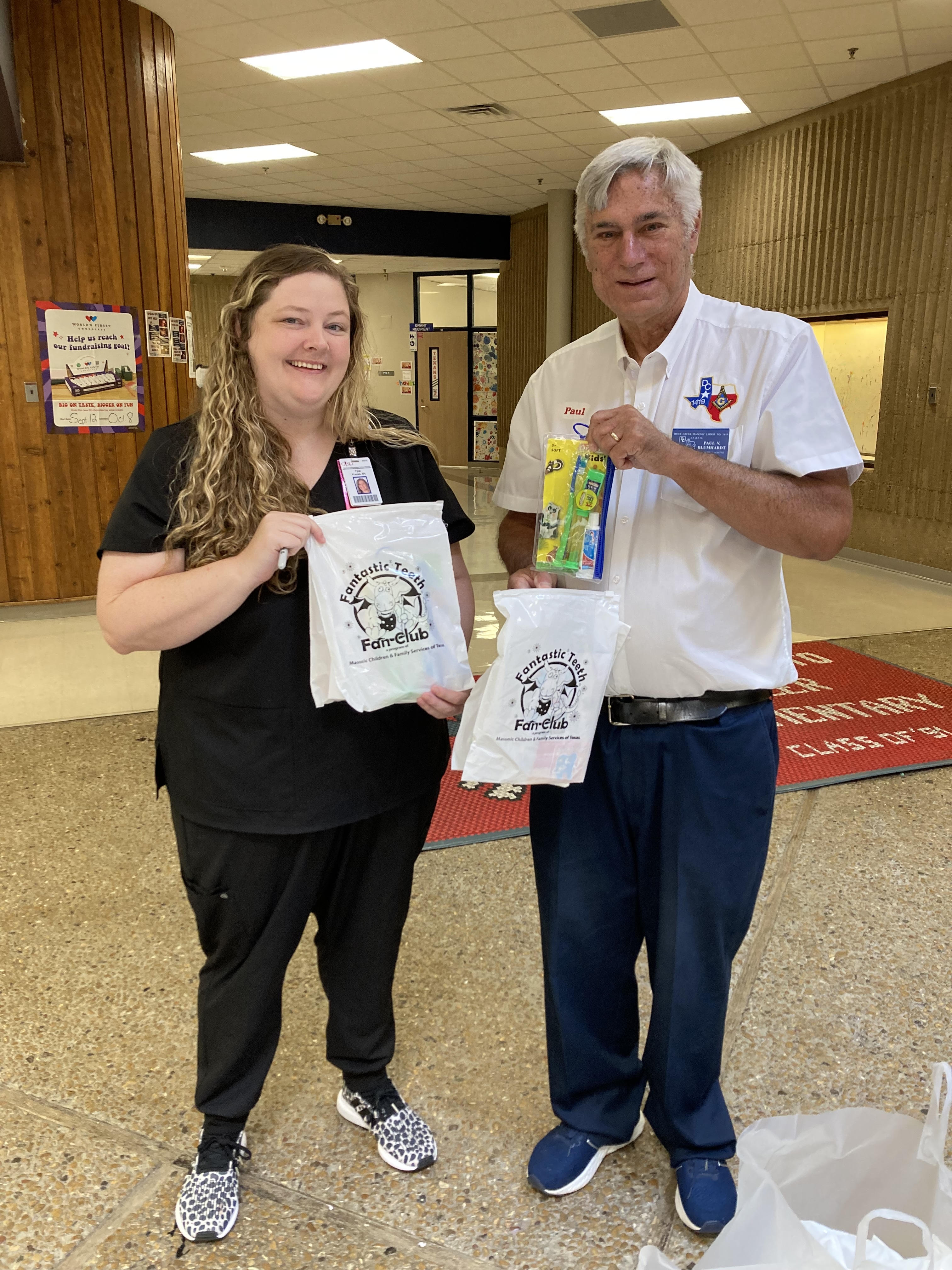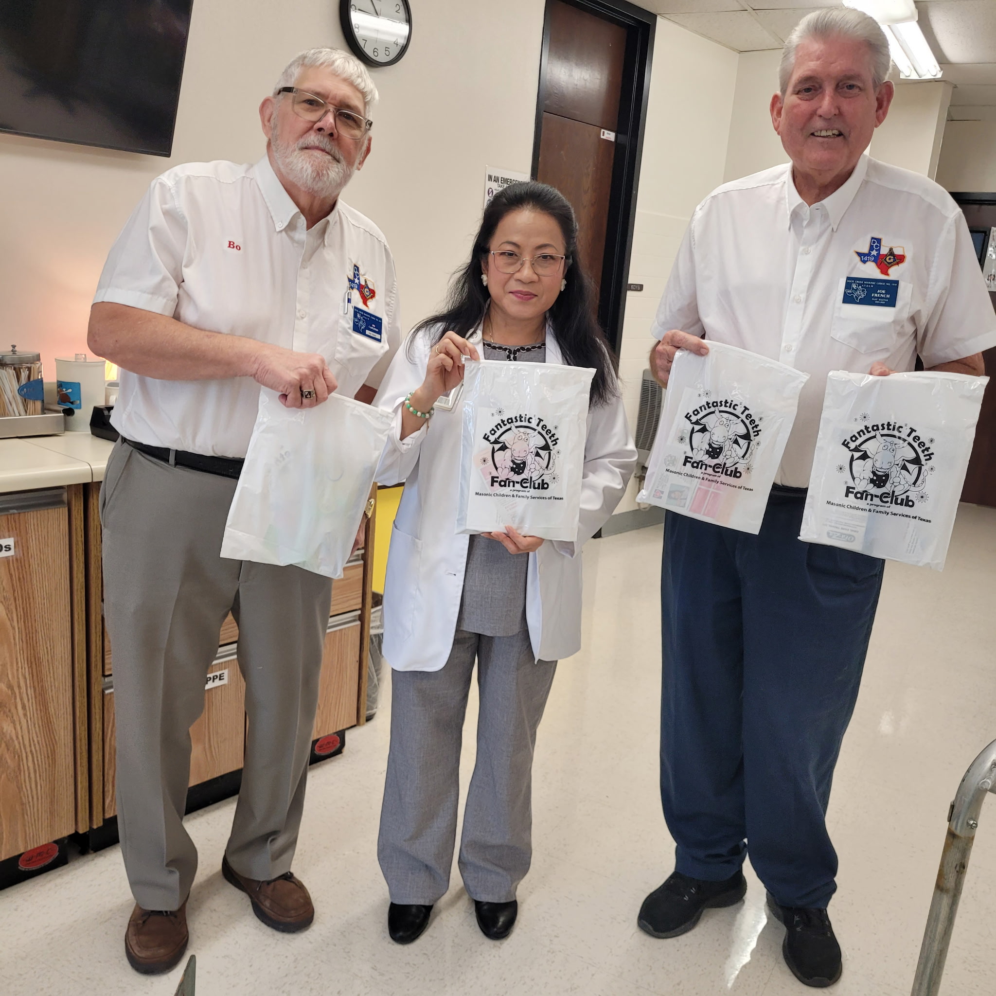 Duck Creek Masonic Lodge #1419 delivered a total of 520 Dental kits to 1st Graders at 6 Garland ISD Elementary Schools, as part of the Fantastic Teeth Fan Club, sponsored by the Masonic Grand Lodge of Texas